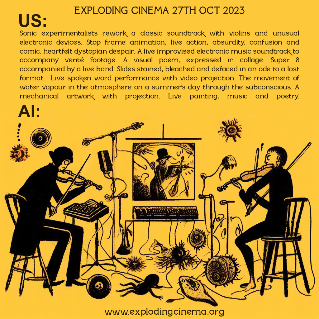 Every so often at Exploding Cinema, between the swathes of quality short films that we present to our adoring audiences, we play host to an expanded film that includes live performance with the projections.It's novel, often quirky, unpredictable and even entertaining. Despite the lavish setup involved it's always worth the hassle.